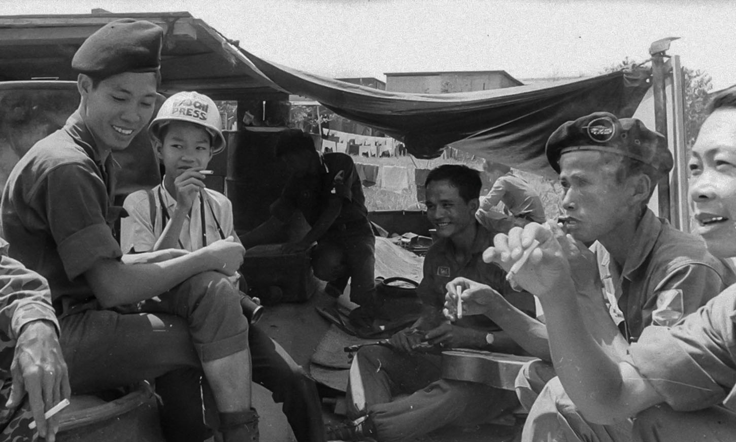 Equipamento: câmeras Asahi Pentax; capacete com “PRESS/BÁO CHÍ”.